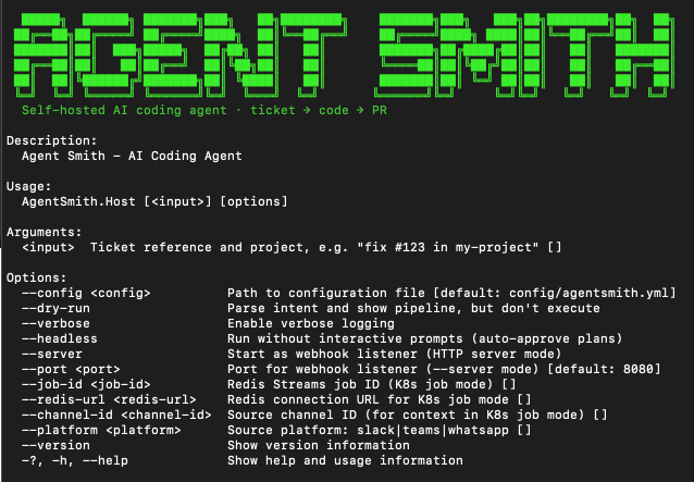 Agent Smith is an open source AI coding agent. You point it at a ticket — GitHub Issue, Azure DevOps Work Item, Jira, GitLab — and it clones your repo, analyzes the codebase, generates an implementation plan, writes the code, runs tests, and opens a pull request. Ticket in, PR out. Fully automated.